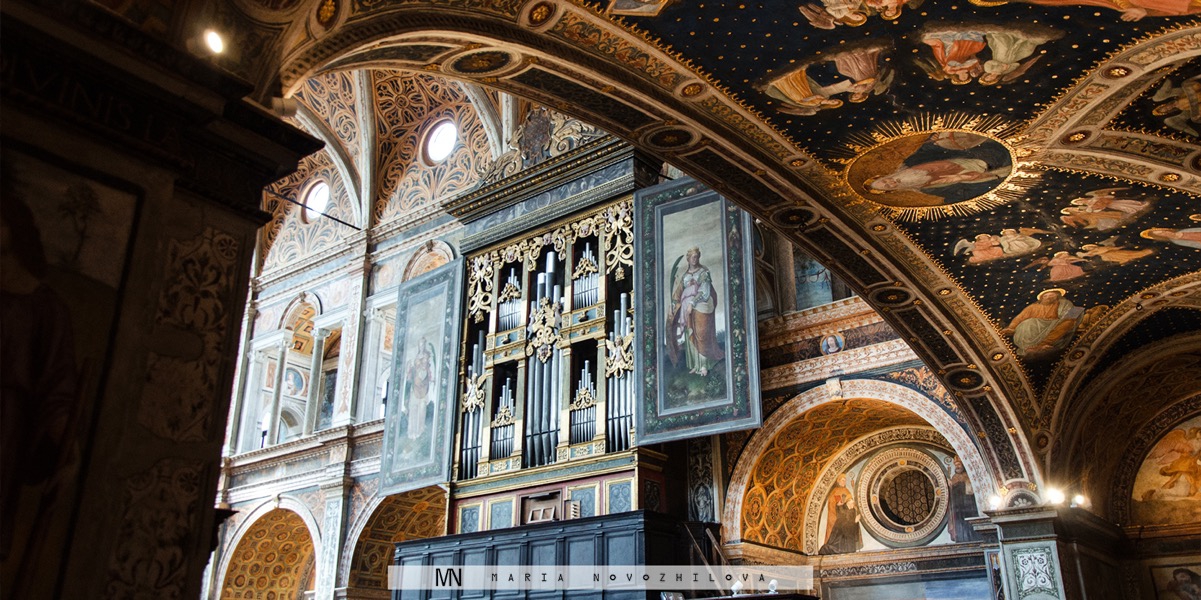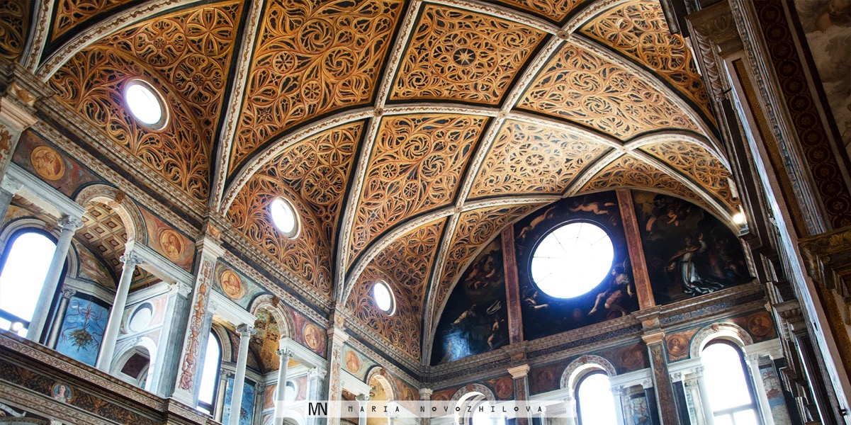 Recently preservation works have been finally completed, and now anyone can enjoy the beauty of the jewel hidden behind anonymous walls of the church. But why so precious and so secret? This church of early Christian origins dating back to the IX century and rebuilt in 1503 was constructed for cloistered nuns of noble origins. The whole structure of San Maurizio is in fact divided into two parts. The first one facing the street Corso Magenta was built for general public. Instead the second secret fraction veiled by a tall wall that rises up to the vault springer but however does not reach the ceiling was dedicated to the cloistered sisters. Luckily today anyone can visit both parts: to enjoy the beauty of the first room and to discover unexpectedly huge and splendid hall of the nuns.