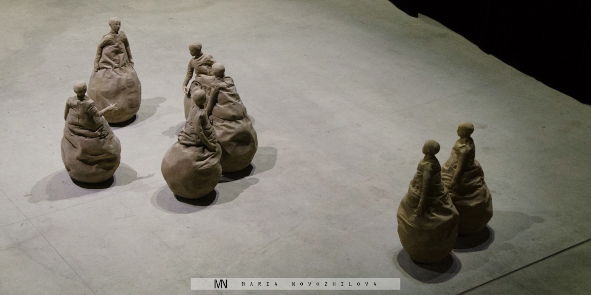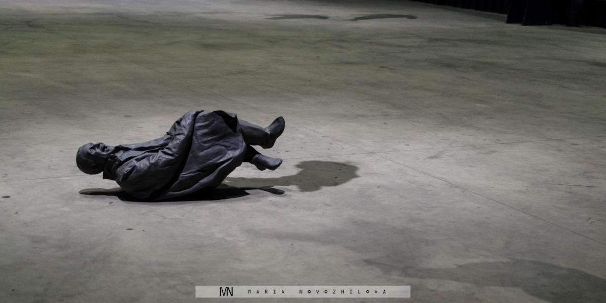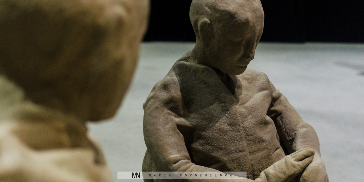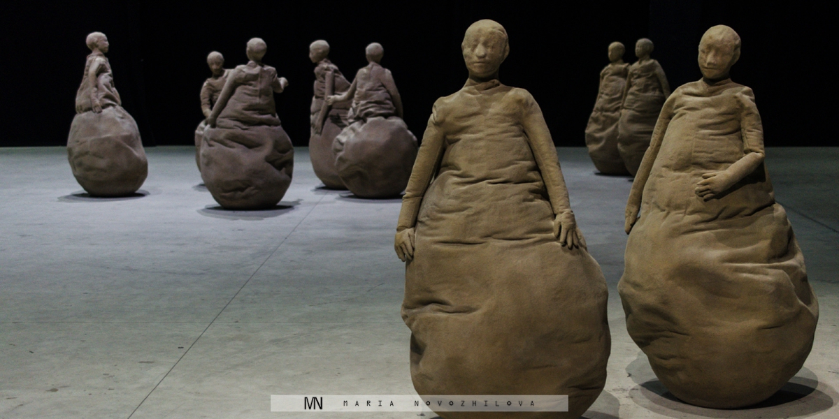 Perhaps the most striking Munoz’s work hided in the very last tall space of the Hangar was “Many times” (1999). It is a dense composition of 50 statues grouped together in one room. Paradoxically, all are unique and, at the same time, identical. While assuming different poses, each has the same face mimicking sarcastic grin and produced by one single mold. If at the first glance these figures appear to interact one with another, later it is clear that each of them is actually independent, if not detached and isolated at all from the context. The same emotional transformation happens with the viewer too. Strolling through this audience of grey silhouettes, all lacking legs and having a height slightly lower than the actual one, one realizes to be different and excluded.